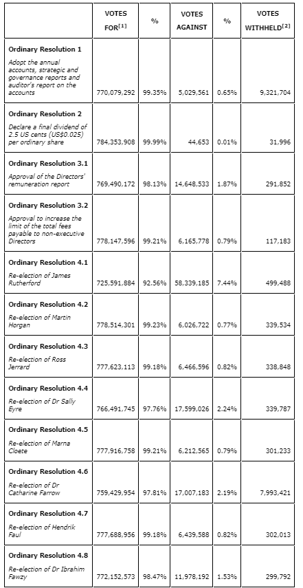 The company's issued share capital eligible to be voted at the AGM was 1,158,432,695 ordinary shares and approximately 67 per cent of the company's issued share capital was voted at the AGM.