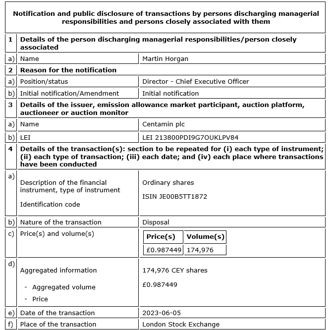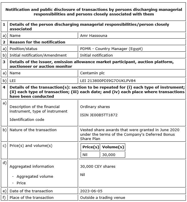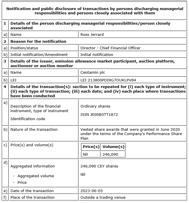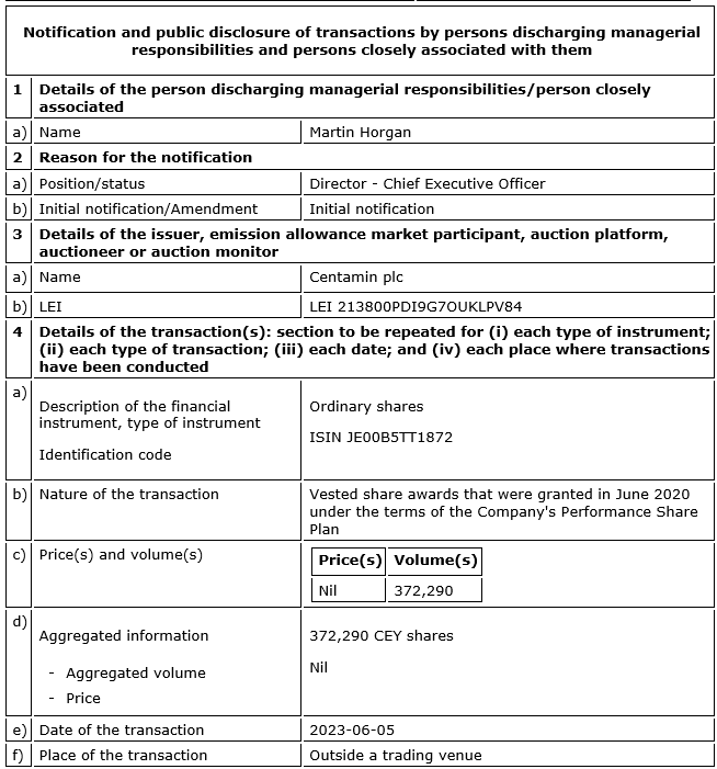 CENTAMIN PLC ANNOUNCES DIRECTOR/PDMR SHAREHOLDING