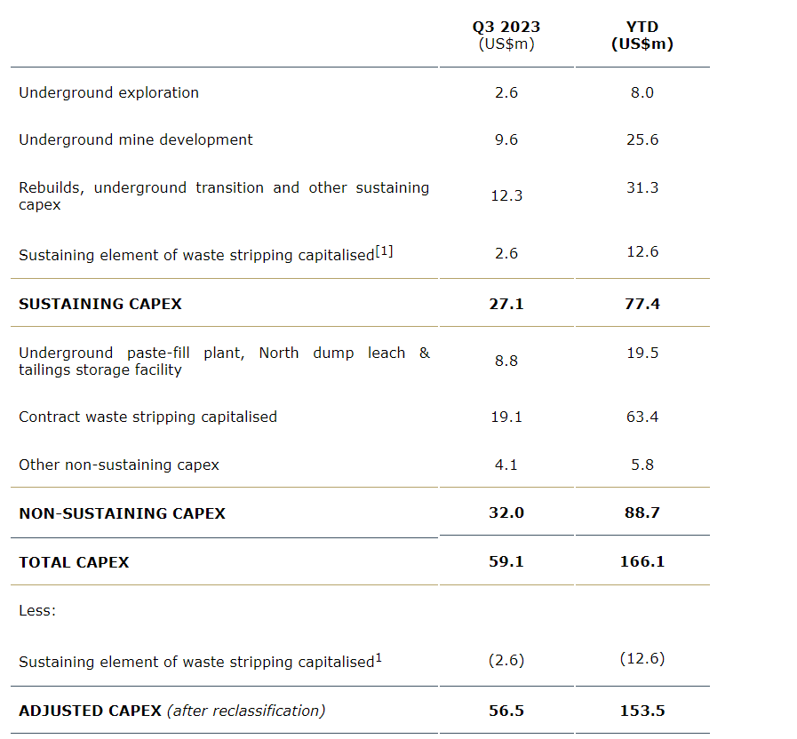 Key capital projects progressed well during Q3, with activities focused around underground development, tailings storage facility 2, equipment rebuilds and the contracted waste-stripping program.