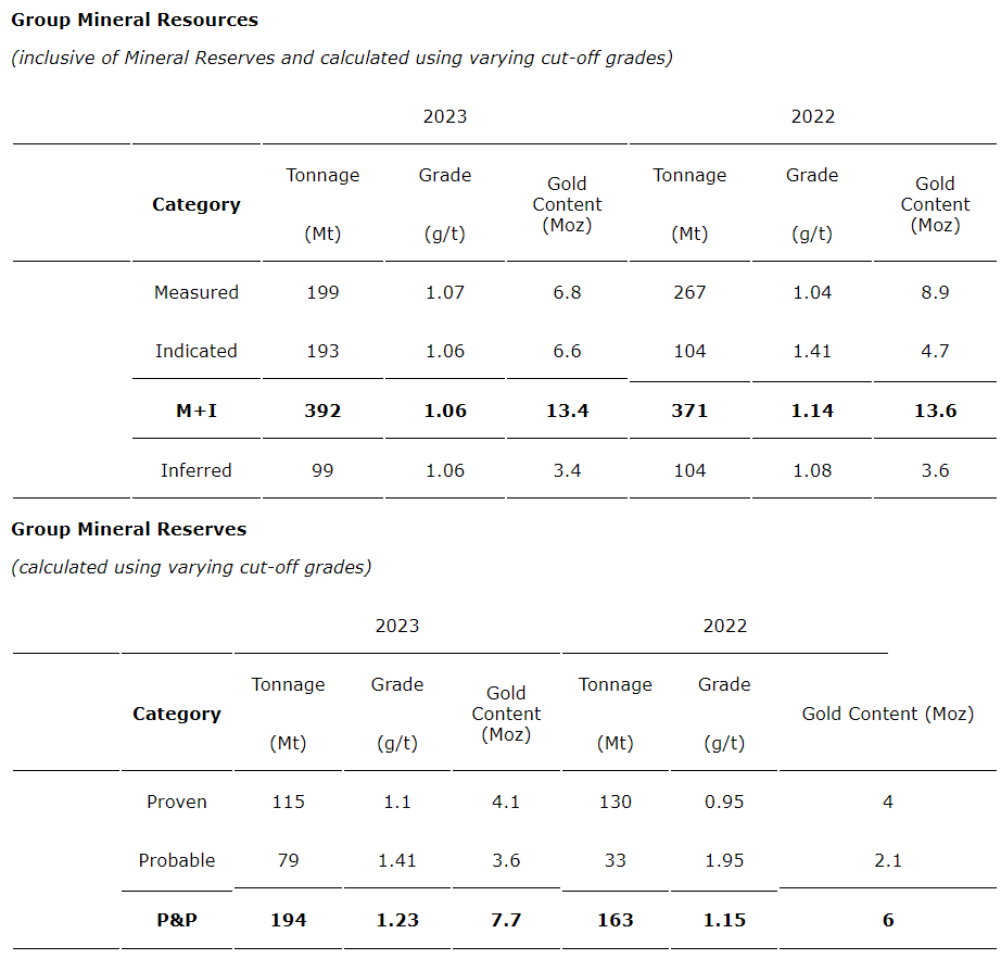 - Group P&P mineral reserves increased 28 per cent compared with 2022, to a total of 194 million tonnes (Mt) at an average grade of 1.23 grams per tonne (g/t) for 7.7 Moz of contained gold, driven by reserve growth at Sukari and the inclusion of maiden mineral reserves at Doropo in Ivory Coast (available on-line).