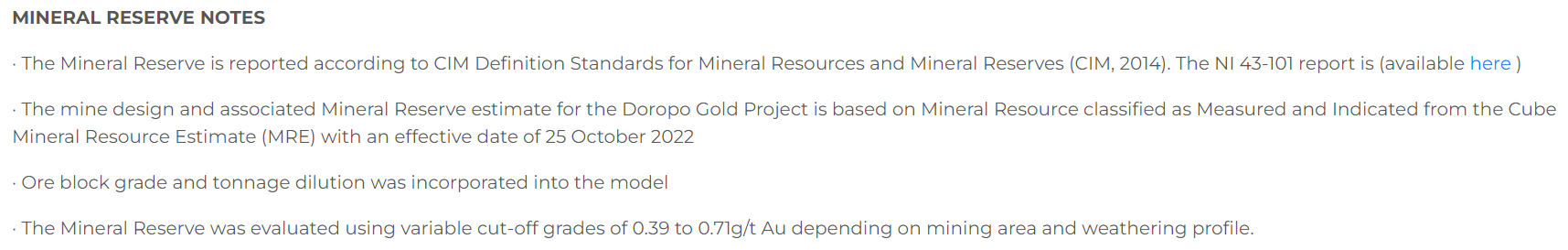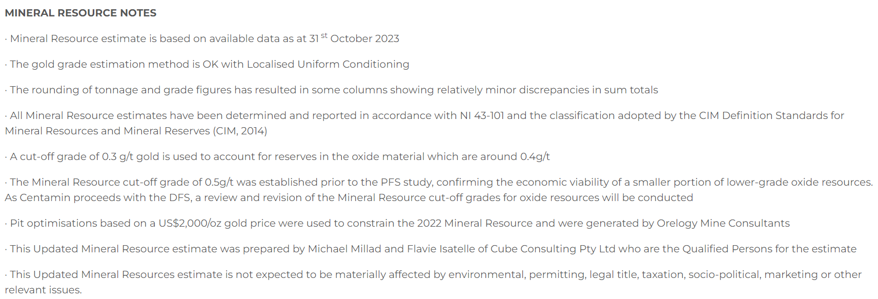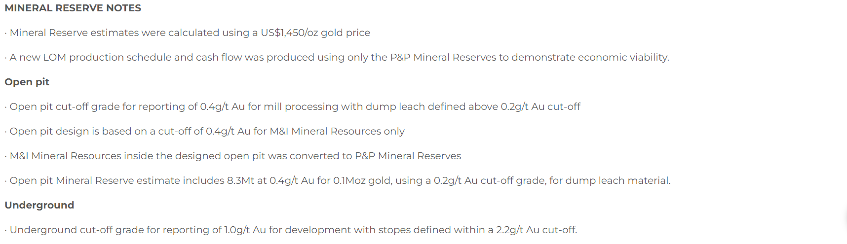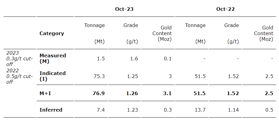 Cut-off grades were lowered from 0.5 g/t to 0.3 g/t to account for the mineral reserves, as detailed herein, in the oxide material which are approximately 0.4 g/t. The gold price assumption for mineral resource estimates was unchanged at $2,000 (U.S.)/oz.