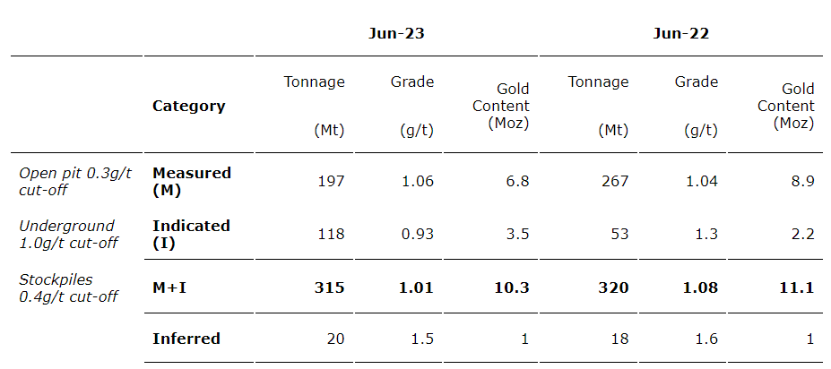 - Group measured and indicated (M&I) mineral resources of 392 Mt at an average grade of 1.06 g/t for 13.4 Moz of contained gold (inclusive of mineral reserves) -- reflecting resource growth at Doropo and depletion at Sukari.