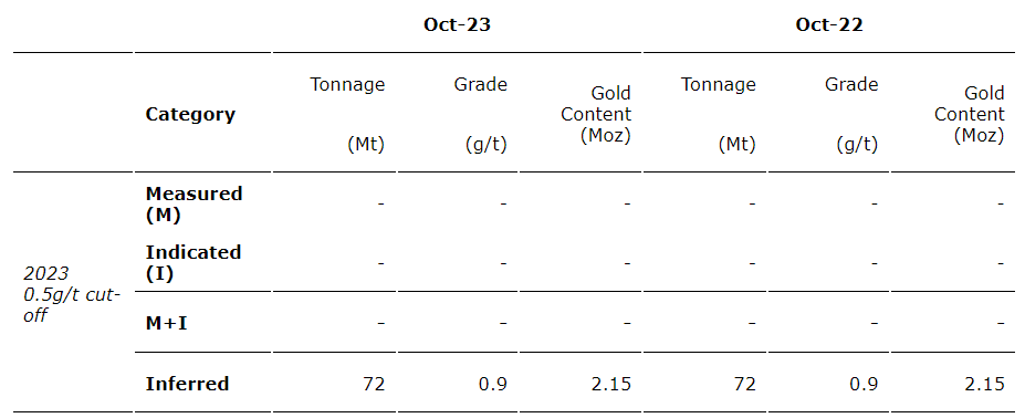 As at Oct. 31, 2023, the ABC mineral resource estimate of 2.15 Moz of contained gold, was unchanged from 2022.