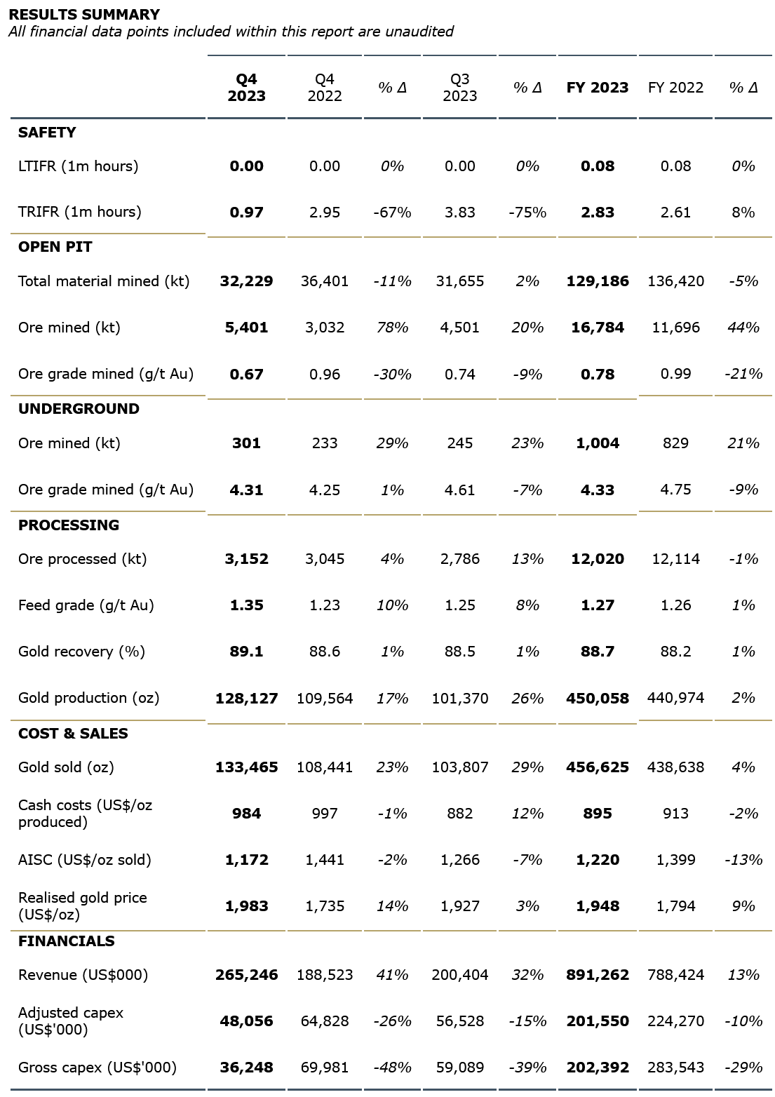 - Annual revenue of US$892 million: Q4 revenue of US$265 million, generated from gold sales of 133,465 oz at an average realised gold price of US$1,983/oz sold; FY23 revenue of US$892 million, generated from gold sales of 456,625 oz at an average realised gold price of US$1,948/oz sold