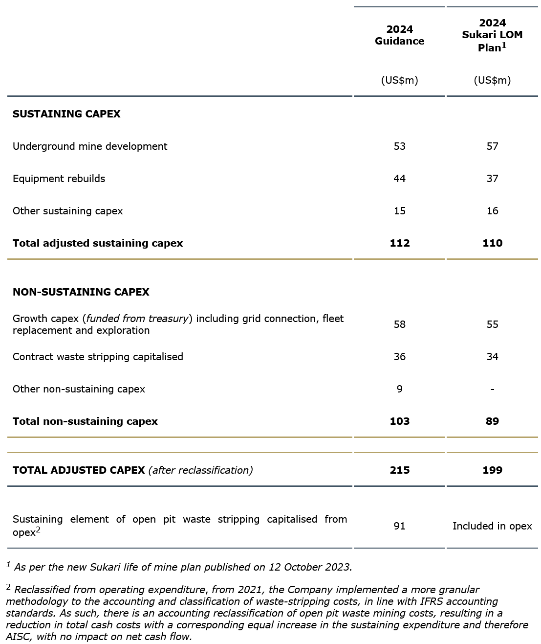 In 2024, adjusted capex guidance is US$215 million, including 2023 deferred capex, US$112 million of sustaining capex and US$103 million non-sustaining capex, of which US$58 million is allocated to growth projects that are funded from Centamin treasury and under the Sukari Concession Agreement are cost recovered over three years. These discreet projects include grid, fleet expansion and underground expansion. Adjusted capex excludes US$91 million of sustaining deferred stripping reclassified from operating costs.
