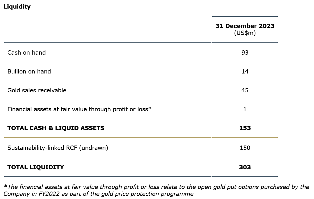 Centamin is in a strong financial position, with net cash and liquid assets to US$153 million as at 31 December 2023. The Company has a US$150 million senior secured sustainability linked revolving credit facility ("RCF") which is available and undrawn.