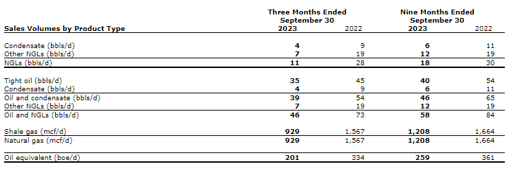 The following is a complete breakdown of sales volumes for applicable periods by specific product types of shale gas, tight oil and NGLs (natural gas liquids).