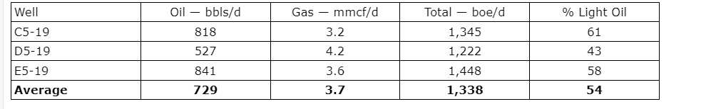 The average rate achieved for the three Lower Montney wells was 1,338 barrels of oil equivalent/day per well, comprising 729 barrels/day of 39 American Petroleum Institute (API) light sweet oil and 3.7 million cubic feet/day of liquids-rich gas. The rates per well were similar as outlined in the attached table.