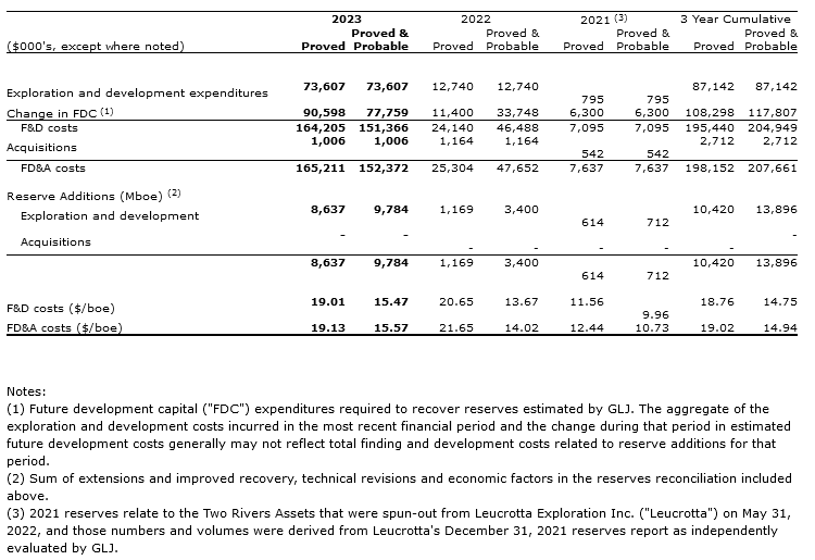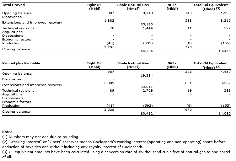 The following summary reconciliation of Coelacanth's working interest reserves compares changes in the company's reserves as at Dec. 31, 2023 to the reserves as at Dec. 31, 2022 based on the GLJ (2024-01) future price forecast: (1,2)