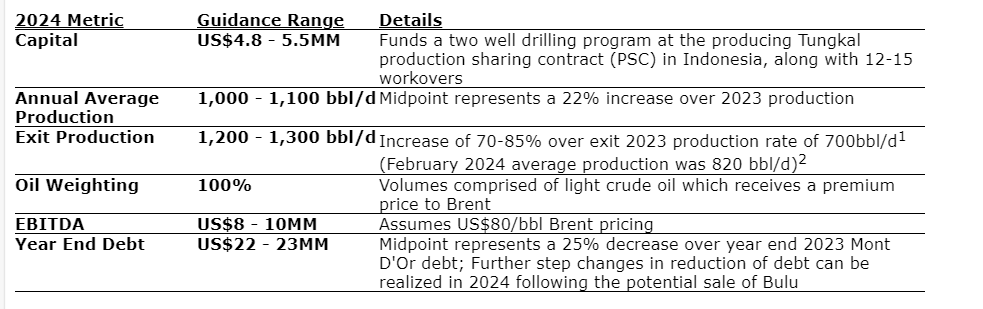 The company has approved a 2024 budget designed to boost production of the newly acquired MOPL assets through capital efficient well workovers, infill drilling and enhancing operational efficiencies, while also deleveraging and strengthening the balance sheet. The capital program and debt reduction outlined is self-financed and can be accelerated should additional capital become available through the course of the year. The execution of the 2024 capital program and associated price assumptions are expected to result in the metrics outlined herein, which form the basis of Criterium's guidance for the full year 2024.