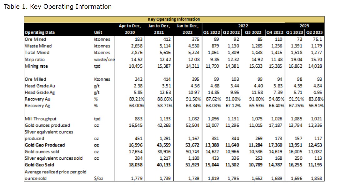 • Q2 2023 gold production of 12,336 ounces and gold equivalent ounce (GEO) production of 12,453 ounces, compared with 11,640 GEO ounces in Q2 2022;