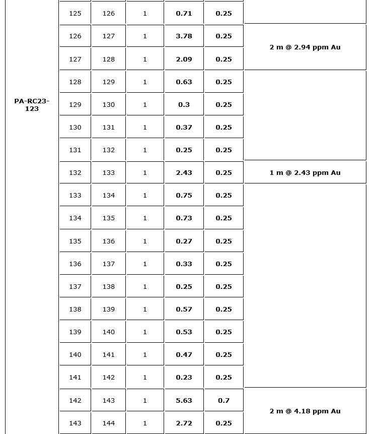 The outstanding results from hole PA-RC23-123 are detailed in the attached table metre by metre from 109 m, where the hole intercepted the mineralized zone. Following the Chulengo empirical model, besides the steep dipping structures, this area is permissive also to host subhorizontal shoots.