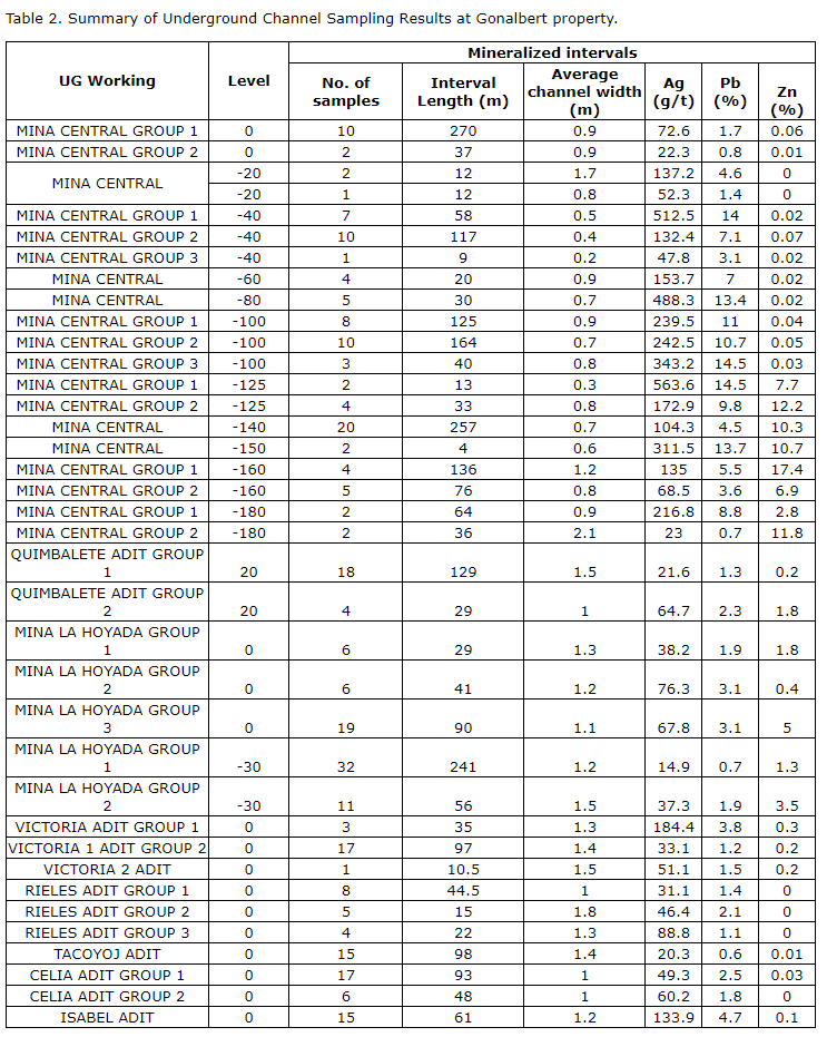 Table 1 lists the underground channel sampling and sample record for the Gonalbert property. A total of 368 channel samples were collected. Average sample width was 1.1m. Sampling was carried out along both the ENE and NNW-oriented drifts on the principal production levels, including Level 0, -40, -60, -80, -100, -125, -150, -160 and -180 at the Mina Central adit, and at the La Hoyada, Tacoyoj and Victoria adits. Underground workings are distributed over an area 2 km along strike.