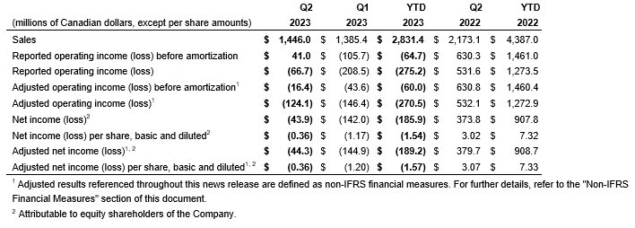Q2 2023 operating loss of $67-million including a $57-million reversal of a previously recognized inventory writedown; adjusted operating loss of $124-million; adjusted shareholder net loss of $44-million, or 36 cents per share;