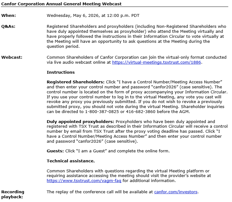 CANFOR CORPORATION ANNOUNCES ANNUAL GENERAL MEETING AND Q1 2026 RESULTS CONFERENCE CALL
