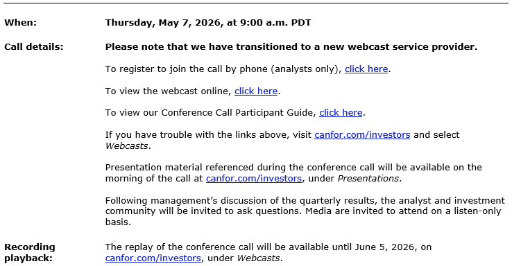 Canfor will hold a conference call on Thursday, May 7, 2026, to discuss its Q1 2026 financial and operating results.
