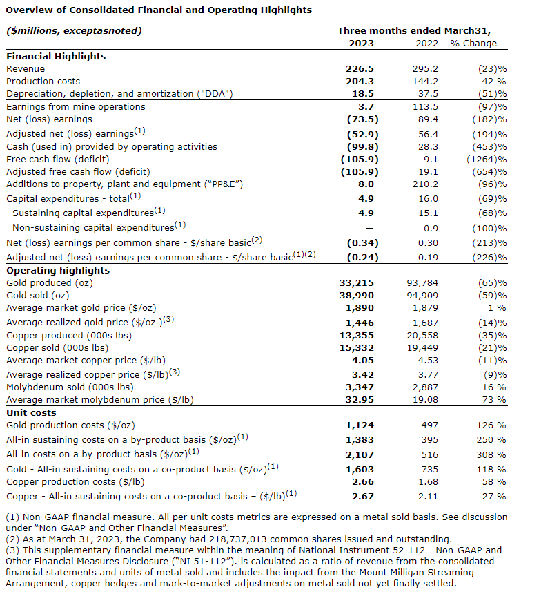 production for the quarter at the Mount Milligan mine was 33,215 ounces and 13.4 million pounds, respectively. Lower production during the quarter was driven by lower plant throughput primarily due to a planned mill maintenance shutdown as well as material handling issues during winter months. Additionally, sequencing of the mining phases during the quarter resulted in lower-than-expected ore grades and differences in the ore-waste transition zone which also impacted feed grades and metal recoveries. Due to mining activities remaining at expected production rates for the quarter, the company continues to be on track to access the higher-grade copper and gold from phase 7 and phase 9 in the second half of the year, but given lower-than-planned production during the first quarter, the company expects 2023 gold production to be near the low end of guidance. Copper production for the year is expected to be at the midpoint of guidance.