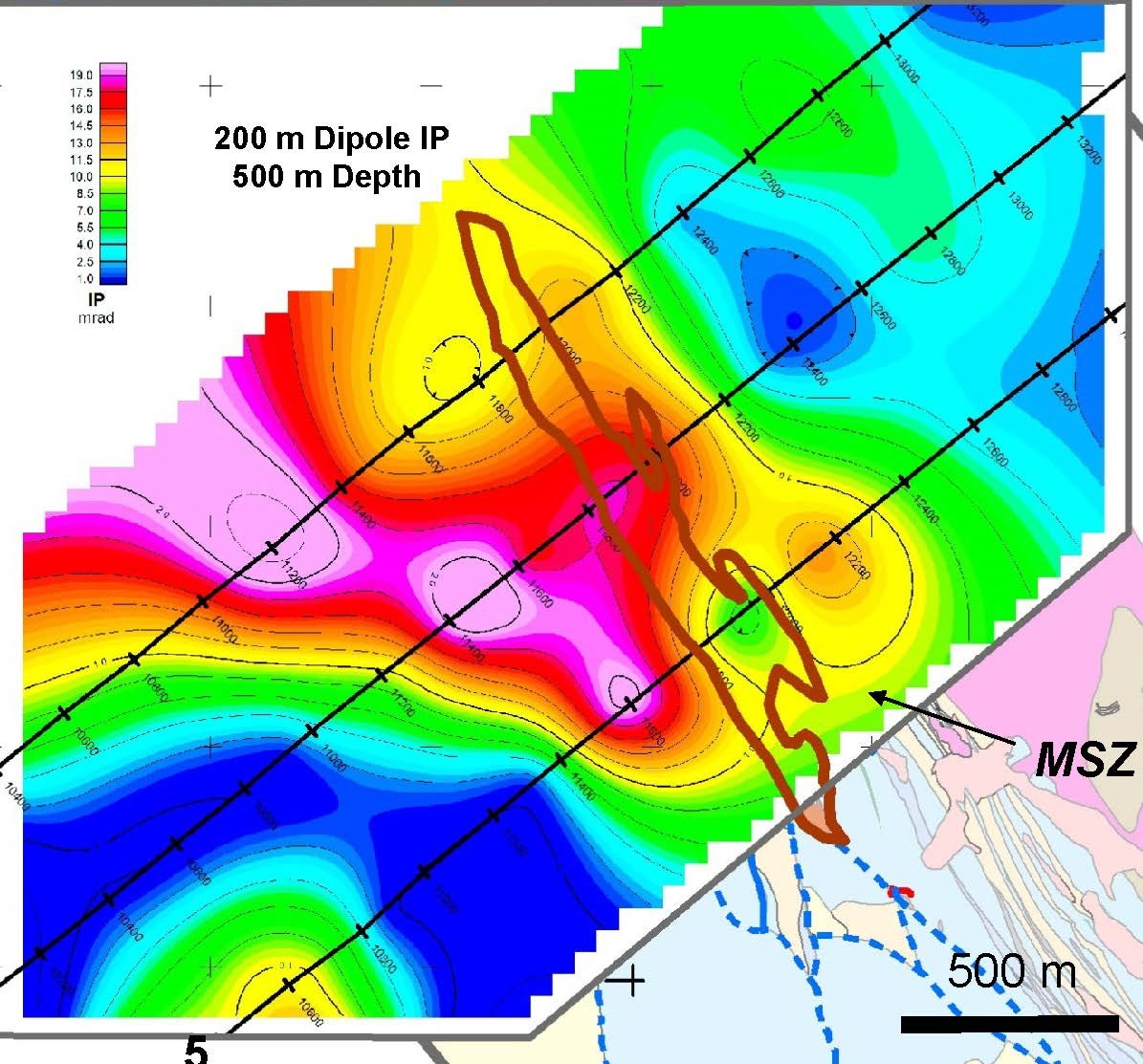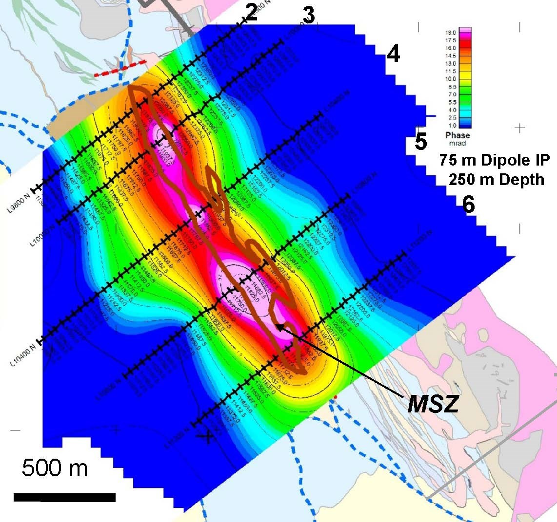 Zonge International, Inc. conducted the survey. Inversion modelling by Zonge identified a continuous IP anomaly with the 75 m dipole spacing, coincident and under the MSZ at least 1,500 m long and 200-300 m wide. The anomaly is open on strike and at depth below 250 m (Figure 1 below). The deeper 200 m dipole survey showed that the IP anomaly detected with the 75 m dipole spacing continues to depth. The 200 m dipole survey also encountered a deeper (400-500 m) separate IP anomaly adjacent to and under the 75 m dipole anomaly (Figure 2 below). The 200 m dipole survey anomaly is open north and south of the surveyed lines.
