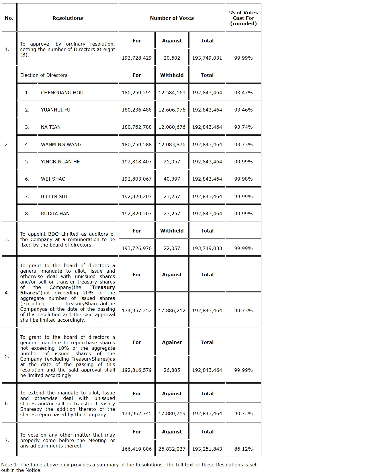of the issued and outstanding common shares of the company, were present in person or by proxy at the meeting. The detailed results are presented in the attached table.