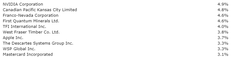 The top 10 investments which comprised 40.1 per cent of the investment portfolio at market as of April 30, 2023, were as noted herein.