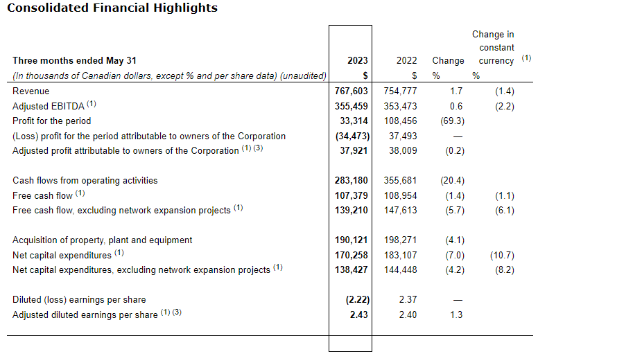 Profit for the period amounted to $33.3-million, while the loss for the period attributable to owners of the corporation amounted to $34.5-million, or $2.22 per diluted share, compared with a profit of $108.5-million, $37.5-million, and $2.37 per diluted share, respectively, in the comparable period of fiscal 2022. The decreases in profit for the period and profit attributable to owners of the corporation resulted mainly from non-cash impairment charges of $88-million related to the radio operations, higher financial expense and acquisition, integration, restructuring and other costs, partly offset by lower depreciation and amortization expense, income taxes, and the appreciation of the United States dollar.