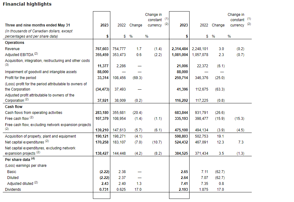 Today, Cogeco Inc. released its financial results for the third quarter ended May 31, 2023.