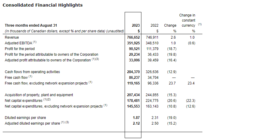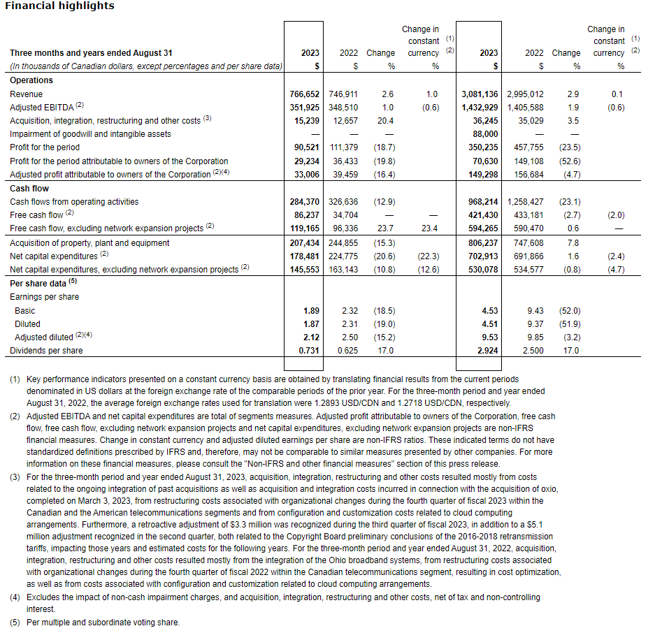 "Our relentless focus on delivering high-quality product offerings and distinctive customer service to our customers was a hallmark of fiscal 2023, resulting in healthy business performance that offset challenges from the inflationary environment, increased competition and global economic uncertainty. Our ongoing commitment to enhancing and expanding our network and service offering with leading edge technology and multiple brands for new and existing customers gives us confidence in our long-term growth opportunities," said Philippe Jette, president and chief executive officer of Cogeco.