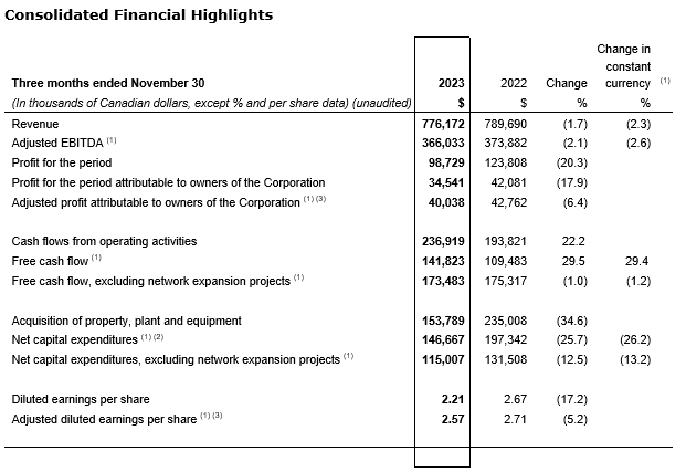 Profit for the period amounted to $98.7-million, of which $34.5-million, or $2.21 per diluted share, was attributable to owners of the corporation compared with $123.8-million, $42.1-million and $2.67 per diluted share, respectively, in the comparable period of fiscal 2023. The decreases in profit for the period and profit attributable to owners of the corporation resulted mainly from higher financial expense, mostly due to a pretax $16.9-million non-cash loss on debt extinguishment recognized following a $1.6-billion (U.S.) refinancing in September, 2023, lower adjusted EBITDA, and higher depreciation and amortization expense, partly offset by lower income tax expense: