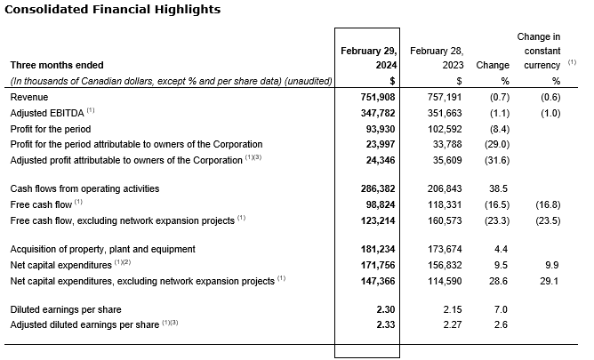 Profit for the period amounted to $93.9-million, of which $24.0-million, or $2.30 per diluted share, was attributable to owners of the corporation compared with $102.6-million, $33.8-million and $2.15 per diluted share, respectively, in the comparable period of fiscal 2023. The decreases in profit for the period and profit attributable to owners of the corporation resulted mainly from higher depreciation and amortization expense and financial expense, and lower adjusted EBITDA, partly offset by lower income tax expense and acquisition, integration, restructuring, and other costs: