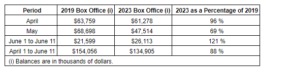 to June 11, 2023, Cineplex's box office revenues are approximately 88 per cent of the same period in 2019 with an exciting lineup of films still to come, including The Flash and Indiana Jones and the Dial of Destiny. For this period, the combined box office and theatre food service revenues in 2023 are approximately 92 per cent of the same period in 2019. For the month of May, 2023, Cineplex reported box office revenues of $48-million, which amounts to 69 per cent of box office revenues generated during the same time frame in 2019 and for the first 11 days of June, 2023, box office revenues are exceeding June, 2019, coming in at approximately 121 per cent of the first eleven days of June, 2019.