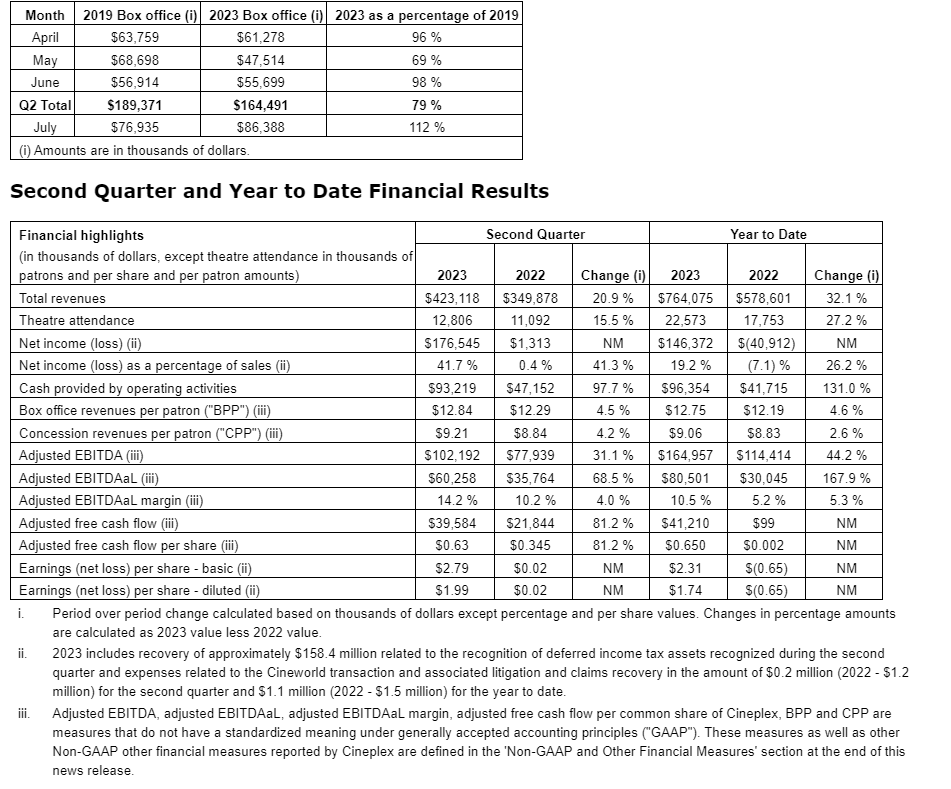 "In addition to a notable second quarter, the third quarter is also off to a sensational start with Barbie and Oppenheimer leading the charge. These remarkable results, as well as the performance of other major titles including Mission: Impossible -- Dead Reckoning Part One, led to Cineplex's July box office revenues not only exceeding 2019 levels but resulted in our highest July box office results ever and our second-highest monthly box office results behind December, 2015. Consumers continue to demonstrate their desire for a shared, immersive cinematic experience, and our studio partners have seen time and again that the best way to elevate and promote films and maximize financial value is with an exclusive theatrical release.