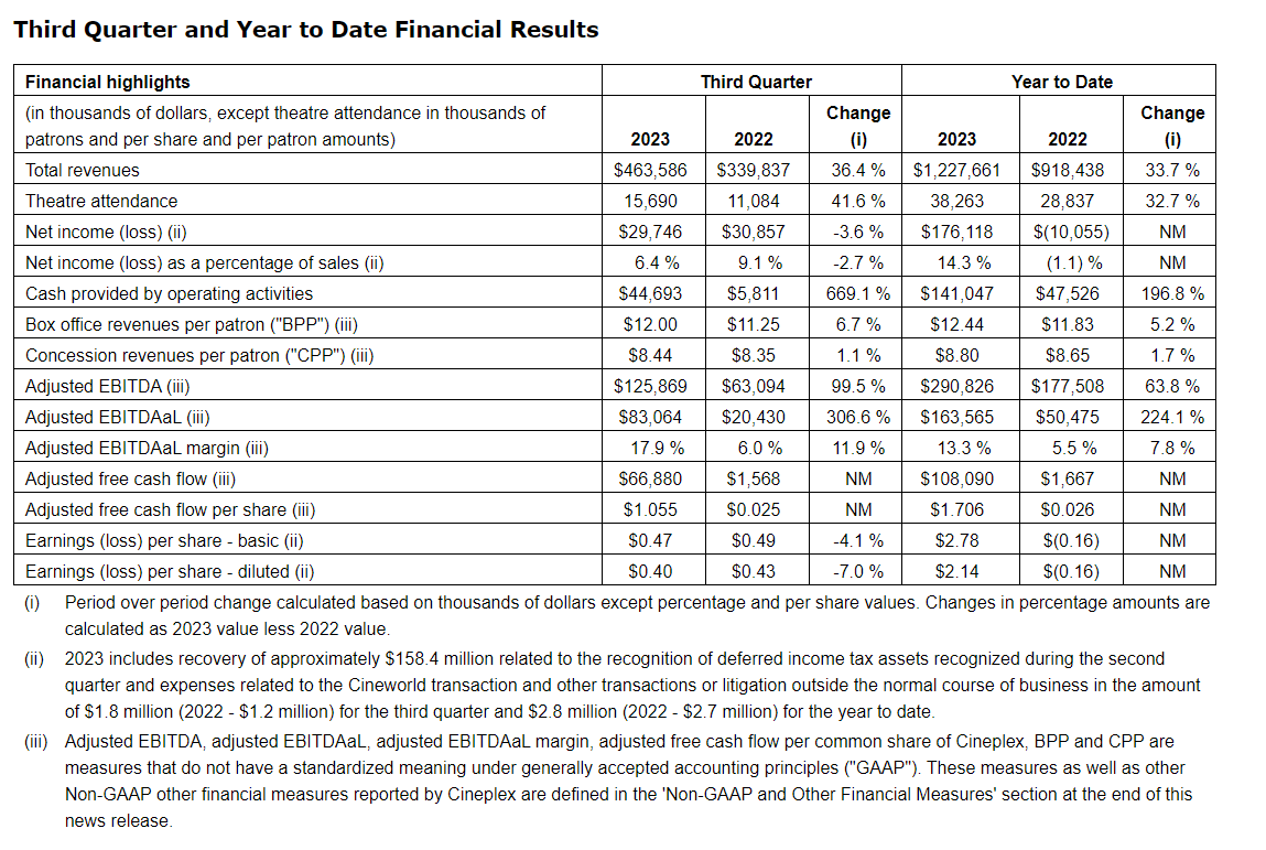 Cineplex Inc. has released its financial results for the three and nine months ended Sept. 30, 2023.