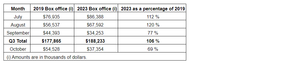 Reported third-quarter record box office revenues of $188.2-million, an increase of $63.5-million, or 50.9 per cent, from $124.7-million due to a 41.6-per-cent increase in theatre attendance as a result of a strong film slate during the quarter, including Barbie, Oppenheimer and Mission Impossible: Dead Reckoning.