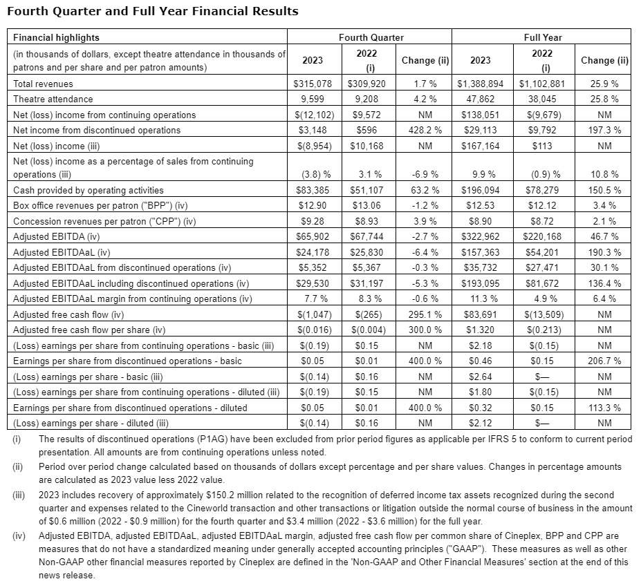 Today, Cineplex Inc. released its financial results for the three months and year ended Dec. 31, 2023.
