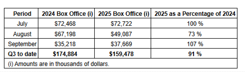 Cineplex Inc. had box office revenues of $37.7-million for September, 2025.