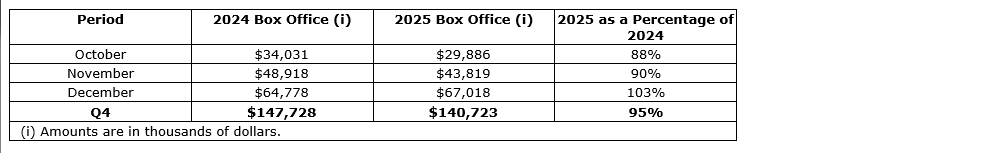 Cineplex closed out 2025 with a December box office that exceeded the prior year, reflecting a compelling and diverse film slate, anchored by marquee franchise releases, demand for premium formats and strong international content. Five Nights at Freddy's 2 kicked off the month with the largest opening ever for a horror film released in December.