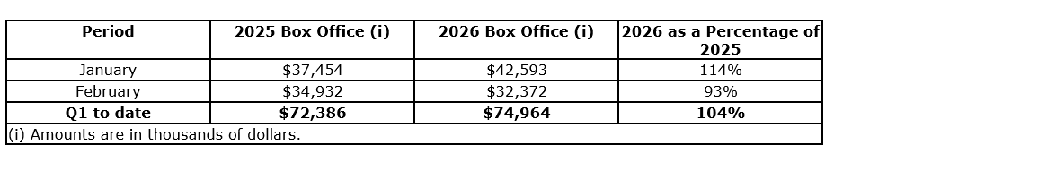 Original titles Wuthering Heights, GOAT and Send Help led the month's performance and collectively supported February box office, reaching approximately 93 per cent of the prior year. Without a blockbuster release, February's box office results reflect the continued importance of a deep and diversified film slate, and demonstrate that a broad mix of films can collectively sustain meaningful box office. The prior period benefited from the release of successful international titles that represented approximately one-quarter of the box office for February, 2025, led by the record-breaking Ne Zha 2 and Chhaava.
