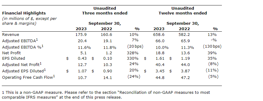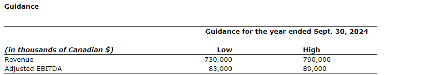 "Given the ongoing robust demand for our products and services, the contribution from recent acquisitions and the benefits from our restructuring plan, we are confident in our ability to post another record year. At the midpoint of our guidance range this translates into revenue and adjusted EBITDA growth of 15 per cent and 32 per cent, respectively, over FY23," concluded Mr. Ford.