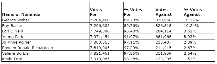 Detailed results of the vote for the election of directors are set out in the attached table.