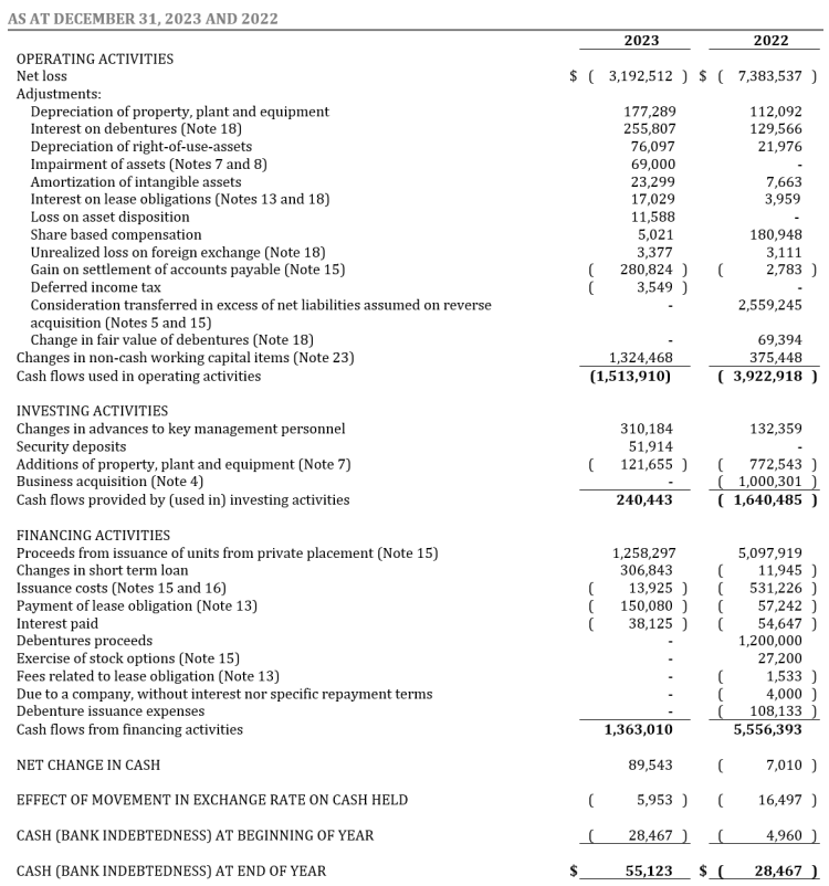 - The company also netted an additional $300,000 in 2023 from the Finexcorp financing agreement, converted on Sept. 30, 2023, to secured convertible debentures at a deemed price of 10 cents.
