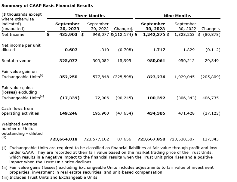 A $137.0-million favourable change in the adjustment to the fair value of the trust's investment in the real estate securities of Allied Properties Exchangeable LP, a subsidiary of Allied Properties Real Estate Investment Trust, driven by the mark-to-market loss in 2023 being significantly smaller than the mark-to-market loss recorded in 2022.