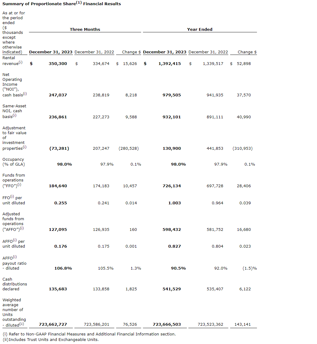 Reported FFO (funds from operations) per unit diluted was 25.5 cents, an increase of 5.8 per cent compared with the fourth quarter of 2022.