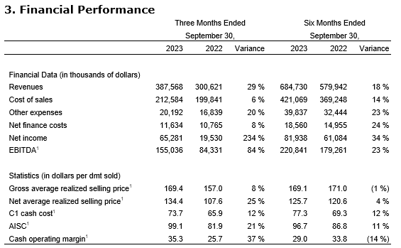 The stripping ratio was 0.57 for the six-month period ended Sept. 30, 2023, compared with 0.71 for the same period in 2022, slightly lower than the company's plan for the 2024 financial year. The company strategically focused on mining ore in the first months of the 2024 financial year with a reduced mining equipment capacity and limited fuel reserves caused by supply challenges related to the June, 2023, forest fires, as fuel inventories were prioritized for critical activities.