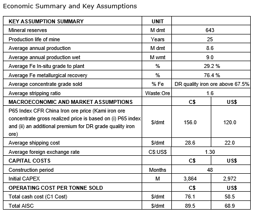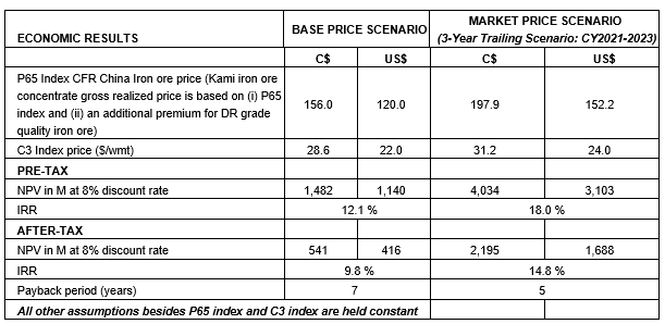 The base case economic assumption of the study utilizes a conservative blended net realized price based on a P65 index price of $120.0 (U.S.) per t for the life of mine, a C3 index price of $22.0 (U.S.) per t and a conservative premium for DR-quality iron ore. The P65 index price of $120.0 (U.S.) per t utilized in the study compares with the trailing-three-calendar-year average price of $152.2 (U.S.) per t and the trailing-five-calendar-year average price of $136.5 (U.S.) per t.