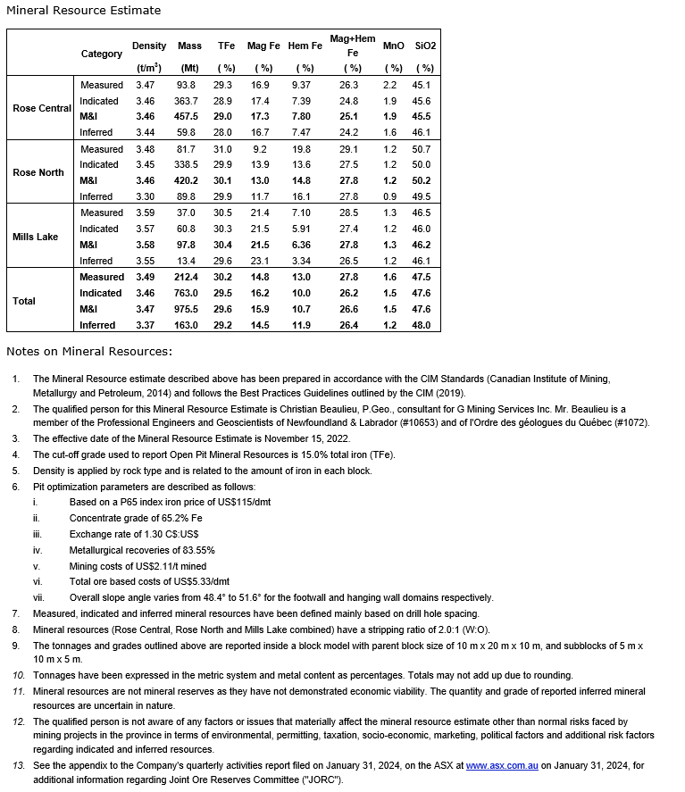 An attached table presents the mineral resource estimate for the Kami project, estimated at a cut-off grade of 15 per cent Fe, inside an optimized open-pit shell based on a long-term reference P62 index iron price of $95 (U.S.) per dmt ($124 (Canadian per dmt) and P65 index iron ore price of $115 (U.S.) per dmt ($150 (Canadian) per dmt). An exchange rate of $1.30 (Canadian) to $1 (U.S.) was used. The open-pit measured and indicated mineral resources for the Kami project, including the Rose and Mills Lake pits, are estimated at 975.5 million t with an average grade of 29.6 per cent Fe and the open-pit inferred mineral resources at 163.0 million t with an average grade of 29.2 per cent Fe. Mineral resources that are not mineral reserves have not demonstrated economic viability.