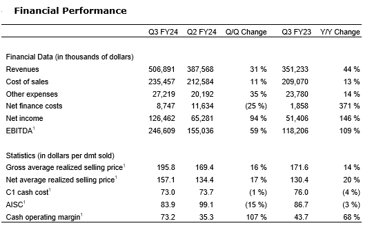 For the three-month period ended Dec. 31, 2023, the company generated EBITDA of $246.6-million (1), representing an EBITDA margin of 49 per cent (1), compared with $118.2-million (1), representing an EBITDA margin of 34 per cent (1), for the same period in 2022. Higher EBITDA was mainly due to higher sales volume and net average realized selling price and lower cash cost, as described above.