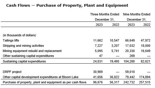 The increases in tailings related investments for the three- and nine-month periods ended Dec. 31, 2023, are part of the company's long-term plan to prepare the site for a higher level of operations with the commissioning of phase II. As part of the company's continuing and thorough tailings infrastructure monitoring and inspections, the company continues to invest in its safe tailings strategy and is implementing its long-term tailings investment plan. The company's tailings work programs are typically completed in the first half of the financial year due to more favourable weather conditions.