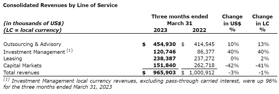 "During the seasonally slow first quarter, investment management and outsourcing and advisory delivered robust growth; leasing was up slightly; and, as expected, capital markets declined considerably in line with overall market conditions. Since our initial outlook 90 days ago, we have seen higher interest rates and challenging debt markets impact transaction volumes. Now, with the additional stress on the banking system and increasing limitations on debt availability, there is more uncertainty around property valuations. Until interest rates stabilize and financing of real estate transactions becomes more predictable, we expect transaction activity to remain muted," said Jay S. Hennick, global chairman and chief executive officer of Colliers.