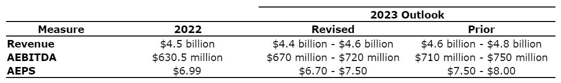 For the quarter ended March 31, 2023, revenues were $965.9-million, down 3 per cent (1 per cent in local currency), adjusted EBITDA (earnings before interest, taxes, depreciation and amortization) was $104.6million, down 14 per cent (14 per cent in local currency) and adjusted EPS (earnings per share) was 86 cents, down 40 per cent versus the prior-year period. First quarter adjusted EPS was not materially impacted by changes in foreign exchange rates. GAAP (generally accepted accounting principles) operating earnings were $22.1-million as compared with $40.8-million in the prior-year quarter. GAAP diluted net loss per share was 47 cents versus 42 cents in the prior-year quarter. First quarter GAAP diluted net loss per share was not materially impacted by changes in foreign exchange rates.