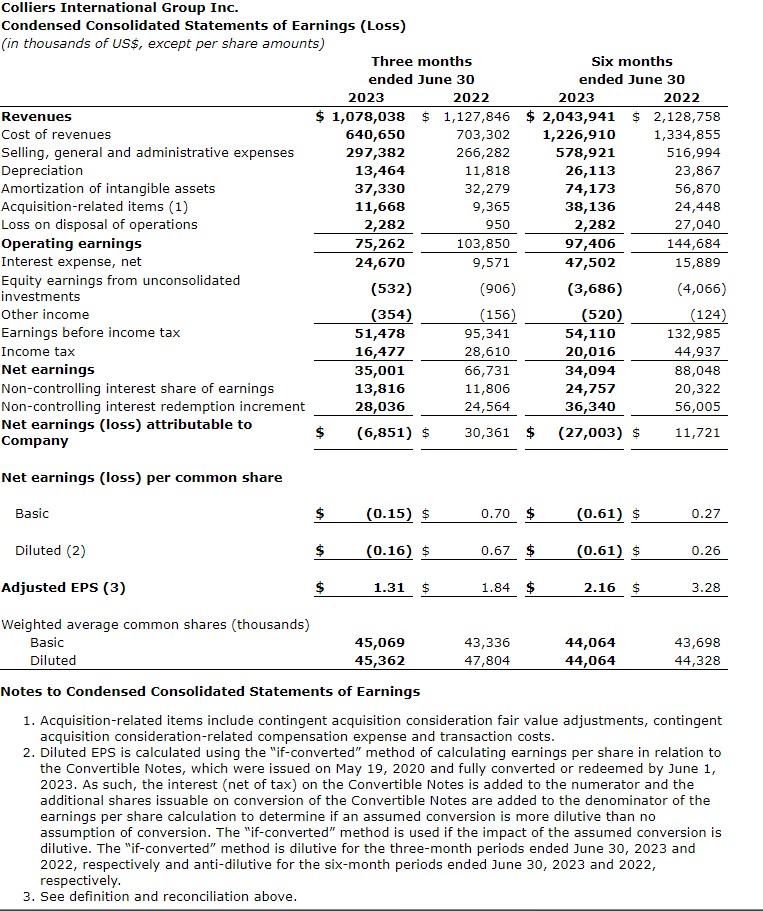 Colliers International Group Inc. has provided its operating and financial results for the second quarter ended June 30, 2023. All amounts are in US dollars.